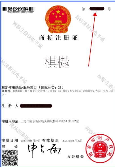 请看下面的商标注册证,右上方红色箭头指的地方: